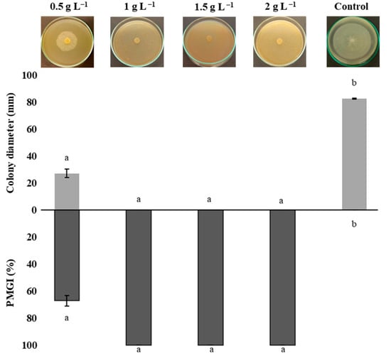 Figure 3 shows the percentage of radial mycelial growth inhibition (PMGI) of P. capsici. Treatments of 1, 1.5, and 2 g L−1 of chitosan achieved total (100%) inhibition of P. capsica mycelial growth. All chitosan treatments exerted an inhibitory effect on P. capsici, with significant differences (p ≤ 0.05) compared to the control treatment. These effects are attributed to chitosan’s ability to alter the integrity of the fungal plasma membrane, which interferes with metabolic processes essential for its development, such as energy production and protein biosynthesis and redox balance [16,40].