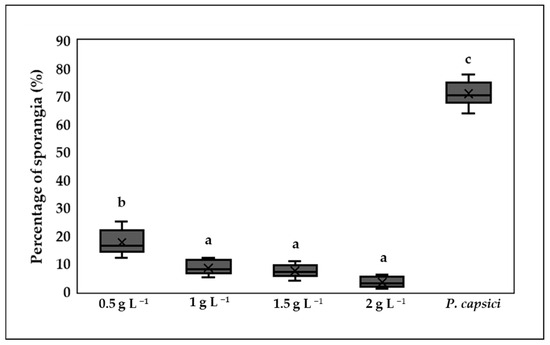 The control treatment showed the highest percentage of germinated sporangia, with a value of 71%. The treatments with the highest concentrations of chitosan (1, 1.5, and 2 g L−1) showed no significant differences (p > 0.05) and recorded the lowest germination values. In contrast, the 0.5 g L−1 treatment showed significant differences (p ≤ 0.05) with respect to the other chitosan treatments. All chitosan treatments were able to inhibit sporangium formation compared to the control treatment (Figure 4).