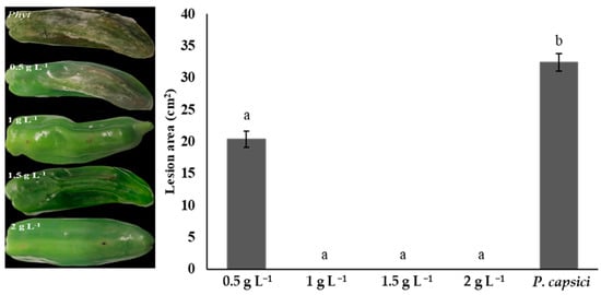 Chitosan treatment reduced the lesion area caused by P. capsici in bell peppers. Concentrations of 1, 1.5, and 2 g L−1 showed the best fruit condition, with a healthy appearance and no visible signs of injury (0%) and no statistical differences (p > 0.05). The 0.5 g L−1 treatment showed symptoms of fruit rot (20.33% lesion); however, its lesion area was significantly reduced (p ≤ 0.05) compared to the control. Fruit exposed only to P. capsici without any chitosan treatment exhibited significant damage (32.39% lesion) and had no commercial value (Figure 5).