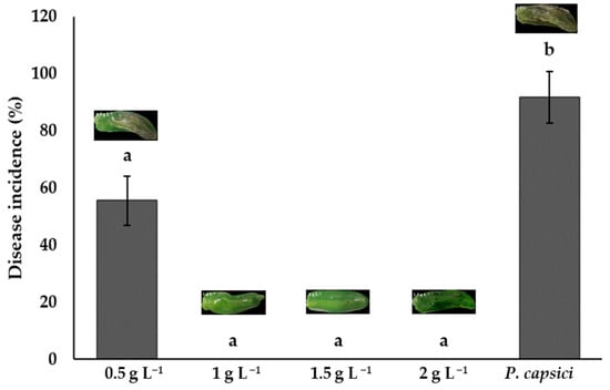 Bell peppers treated with chitosan at concentrations of 1.0, 1.5, and 2.0 g L−1 showed no statistical differences (p > 0.05). These treatments had no symptoms of infection and a 0% incidence. The lowest-concentration treatment (0.5 g L−1) had an incidence of 55.56%, but this was lower than the control, which had the highest disease incidence (91.67%). These results demonstrate chitosan’s ability to prevent the establishment of this phytopathogen and maintain fruit quality (Figure 6). The concentration of 1 g L−1 is sufficient to inhibit P. capsici infection, as the same results were observed with higher concentrations.