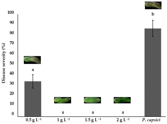 Bell peppers treated with chitosan at concentrations of 1.0, 1.5, and 2.0 g L−1 showed no visible signs of infection, with 0% disease severity and no statistical differences (p > 0.05) between them. Nonetheless, the concentration of 0.5 g L−1 showed a disease severity of 34.44%. The positive control (phytopathogen without chitosan) presented the highest severity at 86.11%, which demonstrates the high virulence of P. capsici. These results demonstrate the potential for the use of chitosan as a biological control strategy to inhibit the development of P. capsici in bell peppers (Figure 7).