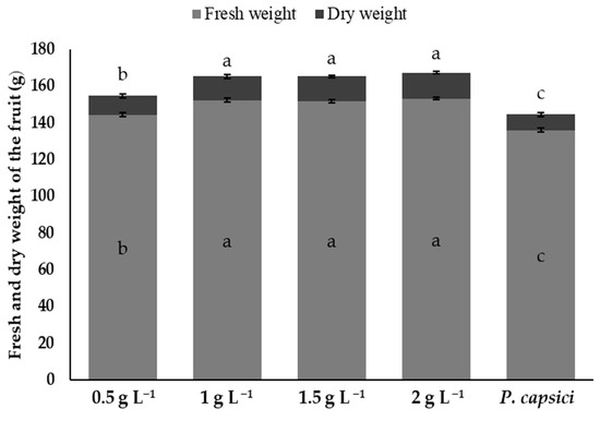 The effect of chitosan on the fresh and dry weight of bell pepper fruits infested with P. capsici was determined. Fruit fresh weight (g) was determined using a technical balance (Sartorius Entris 2202-1S, Sartorius AG, Göttingen, Germany, 2 kg ± 1 g) for all treatments. Subsequently, the dry weight was obtained after subjecting the bell peppers to an oven-drying process at 65 °C until a constant weight was reached, which ensured the complete elimination of residual moisture [13].