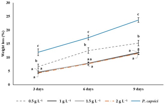 Six replicates per treatment were carried out, considering the bell peppers treated with different concentrations of chitosan (0.5, 1.0, 1.5, and 2.0 g L−1) and a control inoculated with P. capsici but no chitosan.