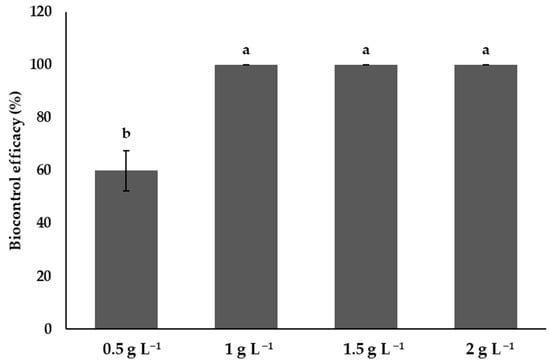 The efficiency of the four chitosan treatments (0.5, 1, 1.5, 1.5, and 2 g L−1) in the control of P. capsici was determined with the formula suggested by Abbott [39].