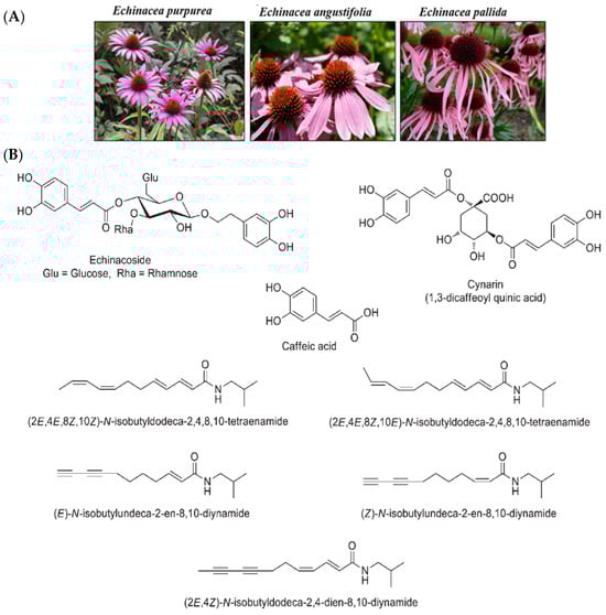 (A) Echinacea species and (B) representative phytochemicals (alkamides and phenylpropanoids) are present in echinacea species (figure drawn by F. Ahmadi).