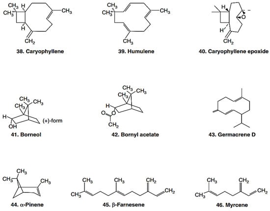 Studies [30] have shown that E. purpurea roots contain up to 0.2% essential oil, with key components including caryophyllene, humulene, and caryophyllene epoxide (Figure 2). The aerial parts of this plant contain less than 0.1% essential oil, featuring compounds such as borneol, bornyl acetate, germacrene D, and caryophyllene and its epoxide, which are also found in E. pallida and E. angustifolia aerial parts [31,32]. Research on E. purpurea achenes has identified various compounds, including a-pinene, b-farnesene, myrcene, and limonene [33]. A comprehensive analysis of volatile components in different plant parts of E. angustifolia, E. pallida, and E. purpurea revealed over 70 compounds, with camphene, b-pinene, and limonene being prevalent across all tissues and species [34,35]. The composition of essential oils varies between plant parts. Aerial parts contain additional compounds like b-myrcene, a-pinene, and trans-ocimene. α-Phellandrene is a major component in E. purpurea and E. angustifolia rhizomes but absent in E. pallida [36]. Aldehydes are more concentrated in rhizome tissue, while terpenoids dominate in flowers and stems [37,38]. This diversity in essential oil composition across different Echinacea species and plant parts contributes to the complex phytochemical profile of these plants, potentially influencing their therapeutic properties [39].