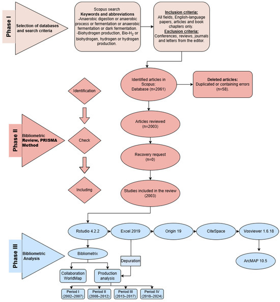 PRISMA-based bibliometric review of anaerobic digestion and biohydrogen research. The review was divided into three phases: (I) selection of database and search criteria, (II) screening and eligibility assessment, and (III) bibliometric and content analysis RStudio (version R-3.2.0), Excel, CiteSpace, and VOSviewer to examine research trends (2002–2024).