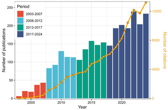 Figure 2 illustrates the annual production of scientific publications related to Bio-H2 production through AD, categorized into four distinct periods: 2003–2007, 2008–2012, 2013–2017, and 2017–2024. The figure demonstrates a notable increase in the number of citations, especially from 2008 onwards; there is a marked acceleration in citation numbers. The most substantial citation rise occurs in the last period, where a sharp peak is observed. This can be attributed to exploring new substrates for Bio-H2 production and a heightened global focus on sustainable and renewable energy sources in response to climate change.