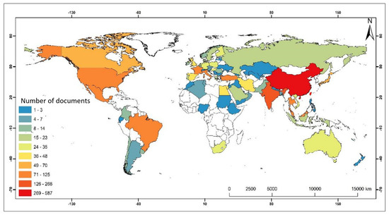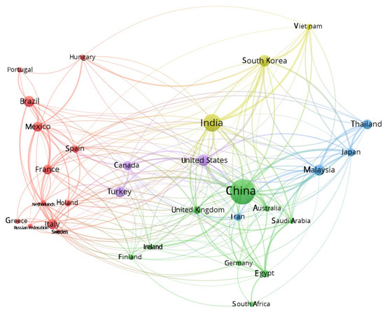 The scientific contributions made by each country allowed the identification of the affiliations and study locations of the subjects in question. As shown in Figure 4, 84 countries have published at least one article. China (in red) is the most influential country, with 552 publications, collaborating with 37 countries, particularly the USA (in bright orange). The second most influential country is India, with 259 publications and collaborating with 31 countries, particularly South Korea and the United Kingdom.