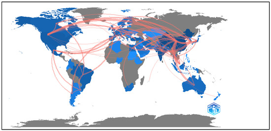 Figure 5 illustrates the collaboration of 84 countries with the scientific literature on the subject. The darker the shade of blue, the higher the level of cooperation with other countries. This highlights more partnerships between Asia and the American continent and, to a lesser extent, with Africa and Oceania. Moreover, at least 20 countries had three collaborative research projects with authors from different countries.