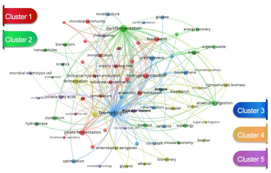 The analysis results have revealed the identification of three primary groups related to AD, biohydrogen production, and biomass. The first group, named “anaerobic digestion” (with 263 occurrences), is the study area with the highest number of words related to the subject, with 26 words connected to 44 nodes. This group has focused on Bio-H2 production from biological waste or via different types of inoculums, substrates, or municipal solid waste [82,83,84]. The second group, “biohydrogen production”, has 252 occurrences with 15 words linked to 44 nodes. This group relates to Bio-H2 production by dark fermentation from wastewater, beet molasses, microbial fuel cells, or organic and food waste [60,76,85,86]. Finally, the third group, “dark fermentation”, with 267 occurrences, comprises seven words linked to 44 lines. This last group is related to studies aimed at producing Bio-H2 using lignocellulosic biomass or silver coffee skin, algae such as Enterobacter cloacae, or nanoparticles [87,88,89].