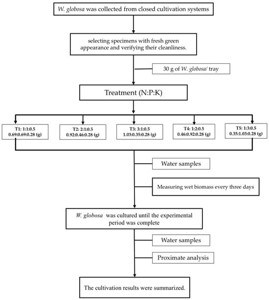 The experimental trays were made of black plastic, measuring 34 × 46 × 10 cm3, and were used for cultivation (see Supplementary Figure S1). Nutrient-mixed water was added to all experimental groups (n = 15), according to the experimental design in Figure 1. The stocking rate of W. globosa was set at 200 g/m2. Given the tray surface area of 0.15 m2, 30 g of W. globosa were placed in each experimental tray. These trays were positioned to receive natural light during morning hours (06:00–10:00 am) with continuous air circulation.