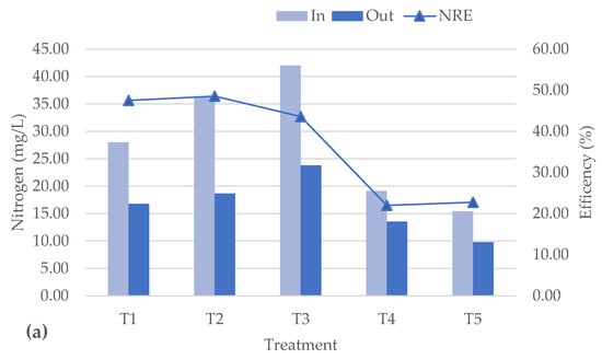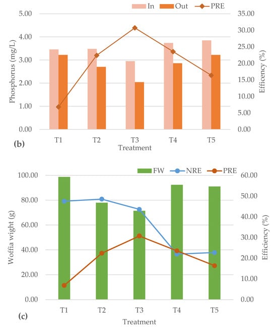 Nitrogen and phosphorus are key nutrients with a crucial role in aquatic plant growth. Studying nitrogen and phosphorus removal efficiency provides insights into W. globosa’s ability to utilize nitrogen and phosphorus. In this study, we found that nitrogen removal efficiency (NRE) varied among experimental treatments, with T2 demonstrating the highest efficiency (48.52%), followed by T1 (47.50%) and T3 (43.55%). In contrast, T4 (21.98%) and T5 (22.73%) exhibited lower nitrogen removal efficiencies (Figure 2a). However, no statistically significant differences were detected among the treatments (p > 0.05).
