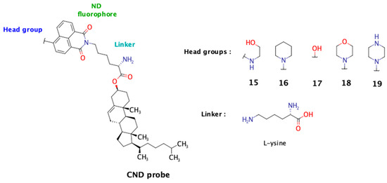 The fluorophore core of CND probes consists of a bifunctional 1,8-naphthalimide scaffold, a push-pull fluorophore whose optical properties are strongly influenced by the electron-rich C-4 substituent (head group) [27]. This design imparts excellent solvatochromic properties, making it highly sensitive to environmental changes [28]. In this study, we synthesized five new CND analogs (CND15–CND19) featuring distinct head groups and an L-lysine linker, which ties the fluorophore to the cholesterol moiety (Figure 1). The probes were obtained through a four-step synthetic route, following an established strategy (Scheme S1) [11]. The choice of the L-lysine linker was driven by previous findings that the hydroxyl group of the L-serine linker affected probe membrane immersion by interacting with water and neighboring lipids. Based on this, we hypothesized that the L-lysine linker might exhibit similar behaviors. Additionally, the positively charged α-amino group under physiological conditions could further influence lipid ordering and enhance cellular uptake.