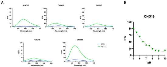 Fluorescence properties of CND probes in different environments and pH dependence of CND19. (A) Emission spectra of CND15–CND19 in water (blue) and 1% octyl glucoside (OG) micelles (green). The fluorescence intensity increases significantly in the micellar environment. (B) pH-dependent fluorescence response of CND19, showing a ~2.5-fold increase in relative fluorescence as pH decreases from 7 to 5, confirming that protonation of the piperazine head group affects its fluorescence properties.