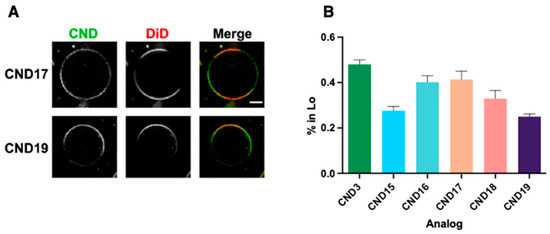Partitioning of CNDs between Ld/Lo phases in phase-separated GUVs. (A) Representative fluorescent confocal image of CND17 and CND19 together with the Ld marker DiD. Scale bar—10 µm. (B) Fraction of each CND analog partitioning into the Lo phase, determined by measuring fluorescence intensity along the vesicle perimeter using the GUV-AP plugin for ImageJ. Data are represented as mean ± SEM.