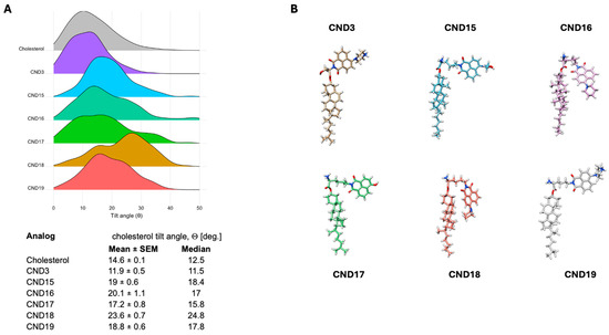 Cholesterol tilt angle distributions and structural comparison of CND analogs. (A) Probability distributions of the sterol tilt angle for cholesterol (gray) and CND3–CND19 (colored). The mean ± SEM and median tilt angles are summarized in the table. (B) Representative molecular structures of CND15–CND19 obtained from MD trajectory cluster analysis compared with CND3, illustrating the ND fluorophore and linker positions relative to cholesterol.