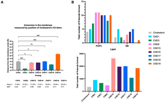 Cholesterol’s hydroxyl group plays a pivotal role in lipid ordering, hydrogen bonding, and lipid interactions, making it a key determinant of membrane structure and dynamics [32]. To evaluate how the CND probes compare with cholesterol in this regard, we measured their immersion depth by tracking the position of cholesterol’s O3 oxygen atom throughout the trajectory. Figure 5A shows that CND15–17 embed themselves in the bilayer at roughly the same depth as cholesterol. Within this series, CND18 penetrates deepest, whereas CND19 remains closest to the surface. The polar nature of this group drives strong associations with water molecules and the phosphate groups of neighboring lipids, as confirmed by the hydrogen bonding analysis (Figure 5B). Among the tested analogs, CND15 (ethanolamine) and CND19 (piperazine) exhibit the highest exposure of their hydrophilic head groups to water, reinforcing their preference for polar interactions. Surprisingly, even CND16 and CND18—despite possessing highly hydrophobic head groups —are positioned in the membrane at a depth similar to cholesterol. This unexpected behavior is attributed to the strong electrostatic interactions facilitated by the protonated α-amino group, which effectively anchors these molecules at an elevated level within the bilayer. Notably, these interactions are significantly stronger than those observed for CND3, where the hydroxyl group of the serine linker provides weaker hydrogen bonding capabilities. These results show that both the head group and linker chemistry strongly affect how the molecules position themselves in the membrane and interact with other components. This highlights how CND analogs behave differently compared to cholesterol.