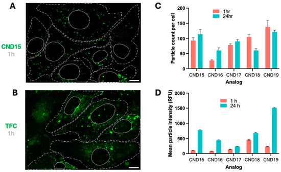 Live-cell imaging was performed using cultured 3T3 mouse fibroblasts. CND analogs and TFC were added directly to the cell media, and the cells were incubated for 1 h. TFC (also known as BODIPY-cholesterol or Bchol) is a well-established cholesterol analog widely used in cholesterol trafficking studies [6], and we have previously employed it as a reference in our prior study [11]. For colocalization studies, LysoView 650 was used as a lysosomal marker. After the 1-h incubation, cells were rinsed with dye-free media to remove unincorporated probes. Confocal imaging was conducted immediately following the incubation and again in a separate experiment 24 h later to assess the localization of the CNDs. At both the 1-h and 24-h time points, we observed a similar intracellular distribution of the dyes. Figure 6A presents the typical distribution of CND fluorescence, which is directly compared with the TFC pattern in Figure 6B. All tested CNDs produce distinct green puncta, though the intensity of these puncta varies with the analog used. In contrast, the TFC signal displays fewer puncta and a more diffuse fluorescence that surrounds the cell. This pattern is consistent with previous reports showing similar TFC behavior when introduced directly into cells from organic solvents [33]. Fluorescent CND puncta were used to generate regions of interest (ROIs) via machine learning, utilizing the Weka trainable segmentation tool. The mean intensity of each identified particle was quantified, and the particle count per cell was determined at each time point (Figure 6C). Overall, CNDs with a lysine linker exhibited higher cellular uptake than those with neutral linkers (CND1–CND10), likely due to the positively charged amino group on lysine. Among them, CND15 and CND19, which contain polar groups, showed the highest uptake at 1 h post-incubation, while CND16, with its relatively hydrophobic piperidine head group, exhibited the lowest. Interestingly, CND18, featuring a slightly less hydrophobic morpholine residue, was taken up much more efficiently than CND16.