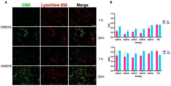 Using TFC as a control, we evaluated its spatial overlap with LysoView (Figure 6B). TFC exhibited consistently high colocalization values at both 1 h and 24 h, as evidenced by its Pearson’s (PCC) and Manders’ (MCC) correlation coefficients, which were among the highest compared to the CND analogs. This strong colocalization is maintained over time, indicating that TFC strongly associates with lysosomes and progressively accumulates within them, in agreement with previous findings [11,33].