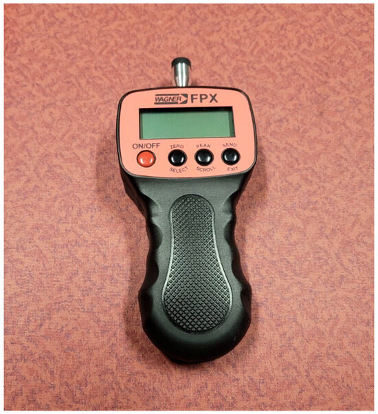Pressure algometry measurements were taken immediately after all TMG measurements were completed during the pre-intervention and post-intervention periods. The Wagner FX-25 pressure was used to conduct all pressure algometry measurements (Figure 5) [5]. This device contains a rubberized end measuring around 1 cm2 that was applied to each muscle site. All measurements were collected in Newtons for the trial. This method of collecting PPT has been shown to have excellent intra-rater reliability in healthy participants [22]. All pressure algometry measures were taken on the participant’s right side. The pressure algometry palpation and application procedures were based on a normalized protocol used by Keilman et al. [5]. This protocol provided procedures for palpating the erector spinae, quadratus lumborum, and piriformis muscles. Each muscle was palpated using these procedures while the subject laid on the table prone, and each spot for the targeted muscle group was marked with a non-permanent marker. The specific palpations for each muscle group are listed below.