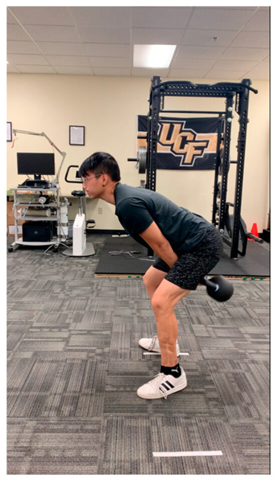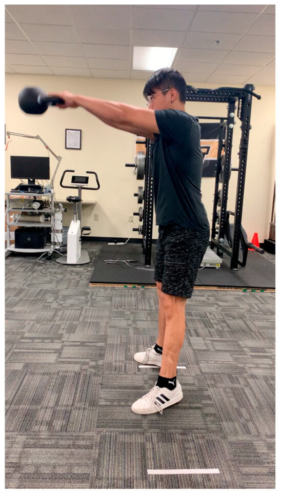 The mechanics of the kettlebell swing followed those outlined in the study carried out by McGill et al. [16]. As described above, participants were taught how to perform a kettlebell swing by a single researcher prior to the warm-up to ensure proper technique during the trial (Figure 9 and Figure 10). During the trial, the researcher provided cues for technique correction if any of the following errors were made: (1) the spine was not kept in a neutral position (e.g., the back was arched), (2) the kettlebell was not in between shoulder level and head height at the end of the swing, (3) the hips and knees were not slightly flexed at the beginning of the swing, and (4) the hips and knees were not in full extension at the end of the swing. The participant was instructed to perform the protocol to the best of their ability, exerting maximal effort as tolerated. Intensity was self-regulated and subjective, reflecting each individual’s perceived level of maximal exertion.