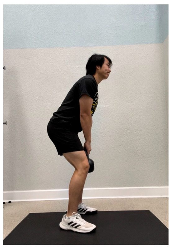 Participants in the isometric hold group performed an isometric hold of the kettlebell for the intervals as previously mentioned (Figure 11). To perform the isometric hold, participants mimicked the initial kettlebell swing position by standing shoulder-width apart with their back in a neutral position and hips and knees slightly flexed while holding the kettlebell in between their legs. Participants were told to “squeeze their glutes” and look straight ahead while they held the weight for each 30 s interval. Verbal cues were provided for form correction during the trial when any of the following errors were made: (1) the back was not in a neutral position, (2) the hips and knees were not flexed, and (3) the shoulders were not retracted and depressed.