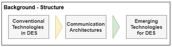 This section presents the background of technological alternatives for DESs. Hence, the section is structured as shown in Figure 1, where details about conventional technologies, communication architectures, and emerging technologies are exposed.