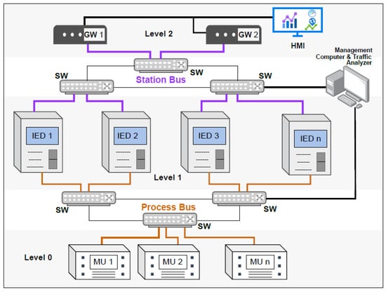 In a DES, there is typical equipment, such as Gateways (GWs) and Human–Machine Interface (HMI) (Level 2); protection, control, and measurement IEDs (Level 1); and MUs or signal processing equipment (Level 0). Typically, these devices are integrated at two communication levels: the station bus (Level 2 and Level 1) and the process bus (Level 1 and Level 0) [15,37,38]. Figure 2 shows a base architecture for a DES, which links the aforementioned equipment to the corresponding communication levels.
