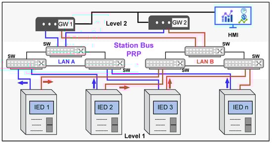 Figure 3 shows the base devices for the level of the station bus in a DES. In this case, the PRP redundancy scheme is implemented. Here, a double-star architecture is identified in which at least two switch-type communication equipment are required as central nodes (LAN A and LAN B). All published information must have two simultaneous output channels in this architecture, and the devices that integrate it must be compatible with the protocol. The information that is transmitted is practically the same, with the only difference being the LAN tagging to which it belongs. In some cases, this architecture is complemented by redundancy in communication equipment (similar to what is described in Figure 2).