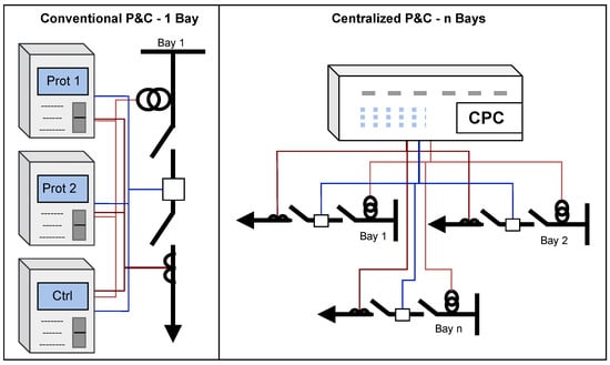 Another technology that has generated significant interest in recent years is a centralized protection and control (CPC) system [54]. This type of technological solution represents a significant change and perhaps the greatest opportunity for DESs to reduce infrastructure, physical space, and engineering processes [55]. A CPC, by consolidating a set of protection and control equipment within a single device (see Figure 5), offers the potential to streamline operations and improve control in DESs [56]. This promising technology instills a sense of optimism about the future of DESs [57].