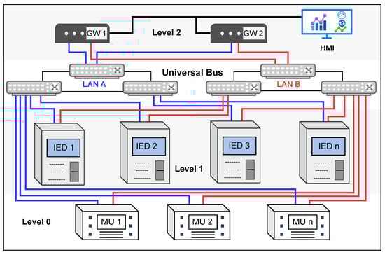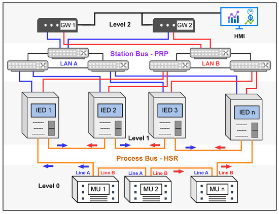 Therefore, when implementing DESs, companies must consider factors such as the security and reliability of the power system [6]. Hence, robust substations are designed with redundancy in multiple pieces of equipment, such as merging units (MUs), intelligent electronic devices (IEDs), and communication switches [7]. In addition, it is generally complemented with redundant communication protocols, such as Rapid Spanning Tree Protocol (RSTP), Parallel Redundancy Protocol (PRP), and High-availability Seamless Redundancy (HSR). These alternatives are selected based on the operational conditions and the criticality level of each electrical substation.