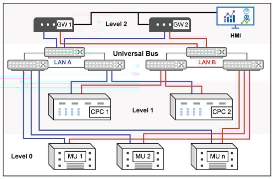 When implementing DESs, the IEC 61850 standard recommends specific technologies and communication protocols depending on the application [8]. At the same time, different operation levels defined as (i) Level 0—process, (ii) Level 1—bay, and (iii) Level 2—station are defined within the electrical substation. The concepts of process bus and station bus are established as communication buses that allow integration between Level 0 and Level 1, or between Level 1 and Level 2 [9].