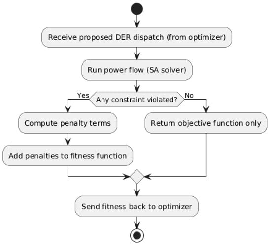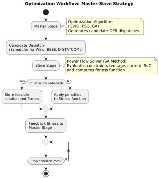 To improve the clarity and transparency of the methodology, Figure 1 provides a block-structured overview of the entire optimization workflow. This diagram illustrates how the master stage (optimization algorithm) generates DER dispatch proposals, which are then evaluated by the slave stage (power flow solver). The results, including any constraint violations and fitness scores, are fed back to the optimizer in an iterative loop. This visual summary clarifies the interaction between both stages and highlights how feasibility checks are integrated into the optimization process, ensuring both performance and compliance with technical requirements.