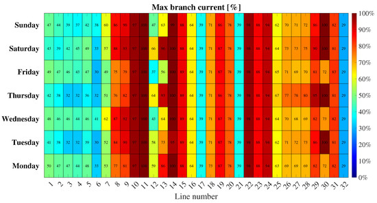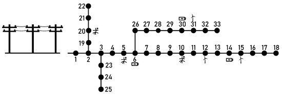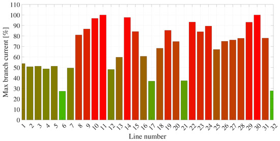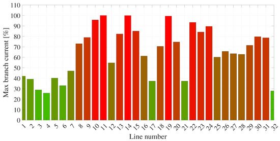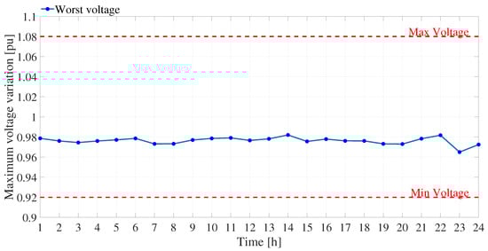 Equations (9) and (10) define the system’s operational constraints regarding allowable voltage and current limits in the network. Specifically, Equation (9) establishes that and correspond to the minimum and maximum permissible voltage levels at node i. Meanwhile, Equation (10) states that represents the current flowing through the line connecting node i to node j during hour h, while defines the maximum allowable current for that line. These constraints ensure that the system operates within safe voltage and current limits, preventing potential violations that could compromise stability and performance.