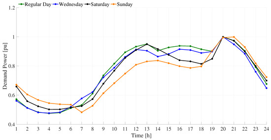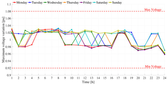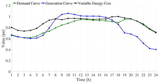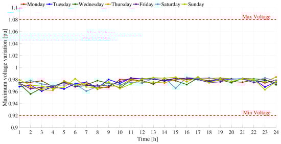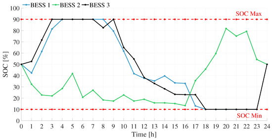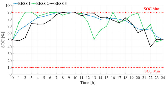 Equation (18) defines the operational limits associated with the State of Charge () of the batteries in the system. In this analysis, operating ranges between and of the are considered, which are characteristic values for lithium-ion batteries [30]. In this equation, and correspond to the minimum and maximum allowed , respectively.