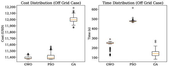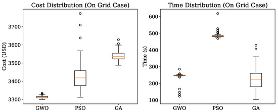 To assess the effectiveness of the proposed methodology, a statistical analysis was conducted based on 100 independent runs for each optimization method. The evaluation considered the best solution, average solution, and standard deviation presented through a box plot analysis. Results demonstrated that the GWO with SA outperformed the other methods in both operating modes, achieving superior performance in cost reduction and system stability.
