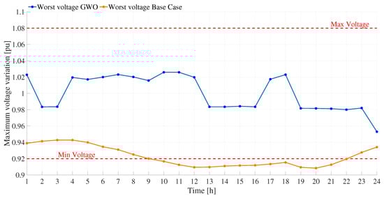 The proposed solution employs a master–slave approach, where the Gray Wolf Optimizer is used for resource dispatch, while an hourly power flow based on successive approximations handles network constraints. The methodology was compared against particle swarm optimization and genetic algorithms using the same power flow model to evaluate its performance.