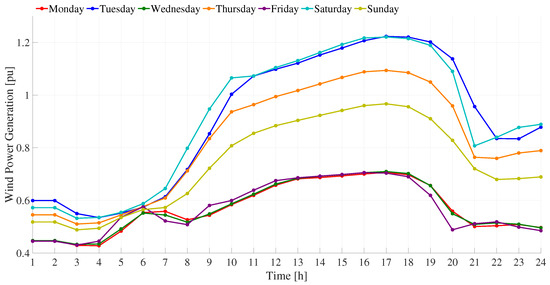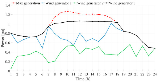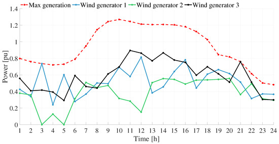 Equation (8) defines the operating limits for WG in terms of their active power output. In this study, their operation is assumed to occur at a unit power factor. In this equation, and represent the minimum and maximum active power injected by the WG at node i, respectively.