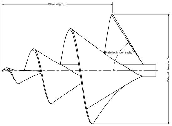 The ASHT comprises a cylindrical shaft which supports three equidistant blades, each with an external diameter () and a helical angle ranging from 0° to 360°. The blades are positioned at relative helical angles of 0°, 120°, and 240° in the angular displacement plane, ensuring uniform distribution around the shaft. The blade radius, represented as /2, is defined as the vertical distance between the blade tip and the center of the rotating shaft. Prototypical ASHT models, specifically designed for the geometric optimization process, were developed using Inventor professional software 2024. For this process, the key factors considered were , the blade length (L), and the blade inclination angle , which was kept constant across all three blades. Additionally, a uniform blade thickness of 3.0 mm was established for all blades. A schematic diagram of the ASHT, illustrating the angular and geometric layout of its components, is shown in Figure 1.
