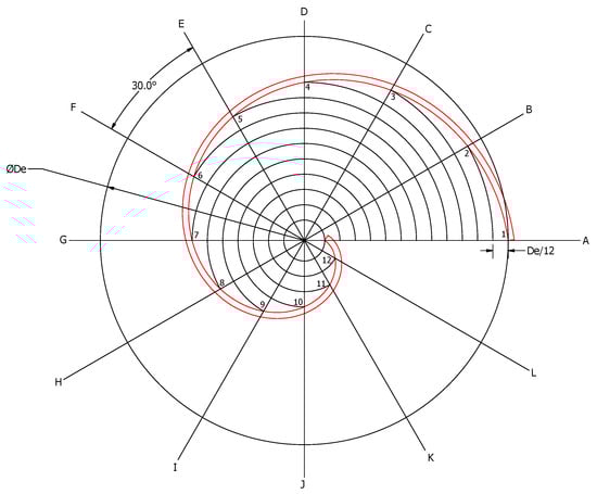 Figure 2. Geometric construction of the spiral hydrokinetic turbine blade. - Identifying key points: Reference points are placed at each intersection of the letters and corresponding numbers, starting from the intersection between line A and circle 1, then line B and circle 2, and so on, until all 12 points are marked.