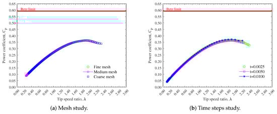 represents a turbine’s efficiency in the conversion of fluid kinetic energy to mechanical energy [25,26]. It is defined as the ratio of the useful power generated by the turbine () to the power available in the fluid flow (). is expressed as Equation (1) [18,25,27].