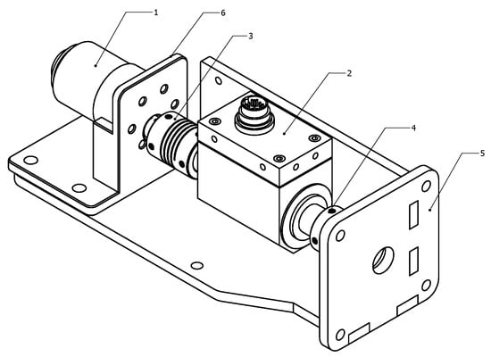 Data acquisition system: (1) DC motor, (2) torque sensor, (3) motor-to-torque sensor coupling, (4) torque sensor-to-turbine shaft coupling, (5) sensor base support, and (6) motor base support.