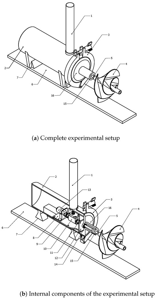 Experimental setup for Archimedean spiral turbine: (1) data cable outlet, (2) vessel, (3) clamping flange, (4) rotor, (5) TurbiMotor base support, (9) motor-to-torque sensor coupling, (10) torque sensor, (11) torque sensor-to-turbine shaft coupling, (12) sensor base support, (13) DC motor, (14) ball bearing, (15) mechanical seal, and (16) vessel cover.
