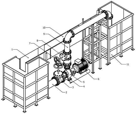 The experimental tests took place in a closed-loop water channel specifically engineered for controlled hydrodynamic investigations. The channel, with an approximate cross-sectional area of 0.495 m × 0.350 m, height and width, respectively, and a total length of about 5 m, exhibited a wetted area of 0.330 m × 0.350 m for the tests. The wetted area is defined as the portion of the cross-sectional area of a conduit that is in contact with the fluid, in this case, water. In other words, it is the area over which the fluid’s frictional force acts directly. The system (Figure 8) includes a pump (5) driven by a motor (6), which ensures the flow’s circulation. On the suction side, the setup incorporates a suction line (2), an eccentric reducer of 10 × 6 inches (4), and a gate valve (3) to regulate flow. The discharge section features a discharge line (9), an 8 × 5-inch concentric reducer (7), and a check valve (8). The entire assembly is connected by a suction (1) and a discharge tank (11), enabling continuous water recirculation.
