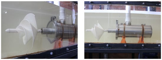 Based on the optimal geometry from the regression model, the turbine rotor was fabricated using 3D printing technology. This manufacturing method was selected due to its ability to produce parts with complex geometries, which is essential for optimizing the performance of the turbine [63,64]. The rotor was 3D printed using polylactic acid (PLA), a biodegradable thermoplastic. PLA is recognized for its excellent printability, dimensional accuracy, and good mechanical properties, making it a suitable material for 3D printed prototypes and functional parts [65]. Additionally, PLA is environmentally friendly and has a lower environmental impact compared to other plastics [66]. The 3D printing process consumed 89.43 m of filament, equivalent to 266.73 gr, and took a total of 8 h and 41 min to complete. A 15% infill density was used, with a bed temperature of 60 °C and a nozzle temperature of 210 °C. The 3D printed rotor was then integrated into the turbine assembly. Figure 9 illustrates the completed turbine installed within the recirculating water channel, ready for performance evaluation.