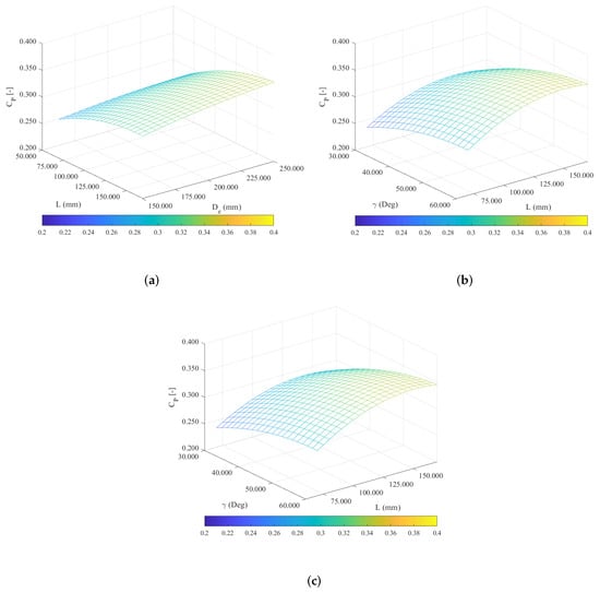 The observation of quadratic curvature in from previous numerical results aligns with the common practice of utilizing second-order response surfaces in turbine design [17,28,32,33,34,35]. Consequently, Equation (5) presents the general expression of a comprehensive regression model that incorporates the three independent factors examined in this study [32,36]: