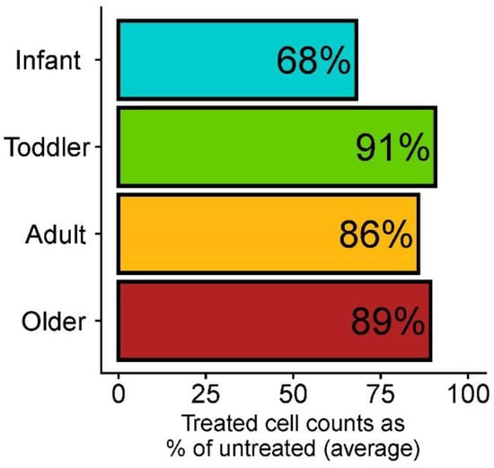 Total cell counts in infants are the most affected by H2S treatment. Bars represent the percentage of cells in treated samples relative to untreated samples (n = 6 per age/treatment).