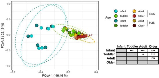 Microbial communities differ primarily by age rather than treatment. Principle coordinates analysis of weighted UniFrac distance shows that the samples are arranged in an age progression. The table represents the results of the pairwise PERMANOVA testing for clustering by age. ** = p < 0.01, *** = p < 0.001, ns = not significant.