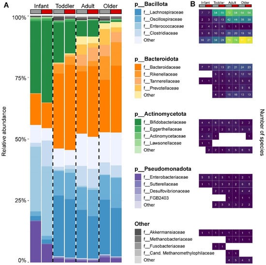 The taxonomic distributions and abundance of the microbial communities of the four age groups were investigated. At the phylum level, Bacillota, Bacteroidota, Actinomycetota, and Pseudomonadota made up more than 98% of all sequences obtained from the four tested age groups (Figure 5A, Supplementary Figure S3). For the toddler, adult, and older adult age groups, Bacillota and Bacteroidota are the predominant phyla; their relative abundances were 44–50% and 34–45%, respectively. Treatment with SSP caused small, non-significant changes in the relative abundance of the four major phyla across those three age groups. For the infant communities, Bacillota (39%) and Actinomycetota (40%) were the major taxa, and their relative abundance values increased with the SSP treatment. The relative abundance values of Pseudomonadota and Bacteroidota only reached 17% and 13%, respectively, and the treatment caused a visible decrease in these values to 7.5% and 10%, respectively.